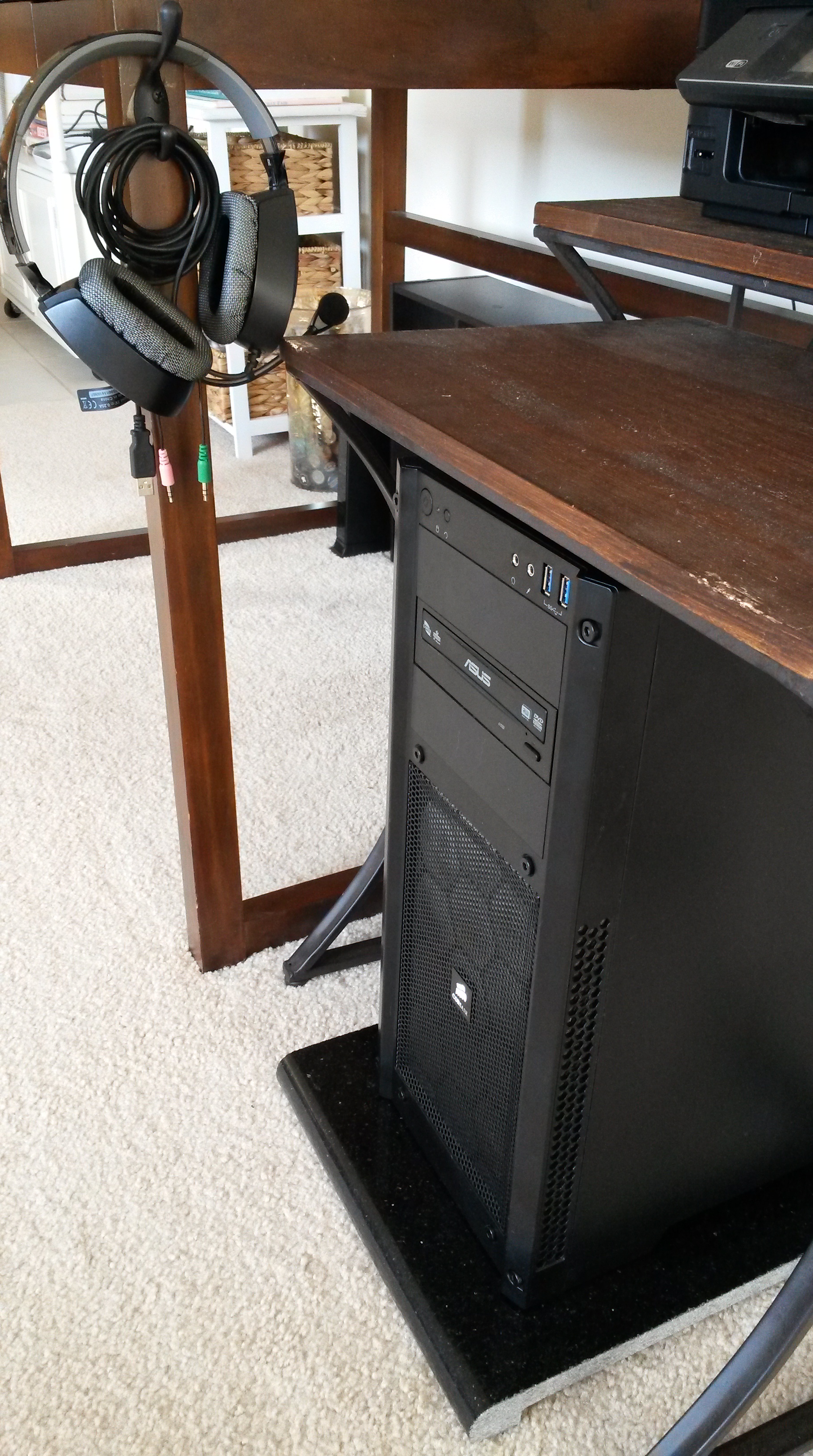 With the desk finally in its proper place at home, I was able to make my final modifications. An effective gaming space has a natural place for everything, keeping your essentials out of the way, but always within reach. I installed a hat hook onto the side of the desk as a makeshift (but ultimately perfect) headphones caddy, a pair of side tables made for a great printer/Wii U stand, and cable clips and velcro straps along the back helped deal with the pesky task of cable management. The final (and my personal favorite) touch was a piece of granite bullnose that I found and had cut down to make a tower stand.